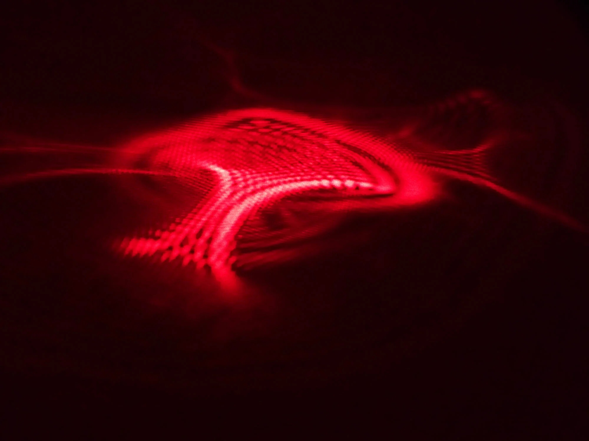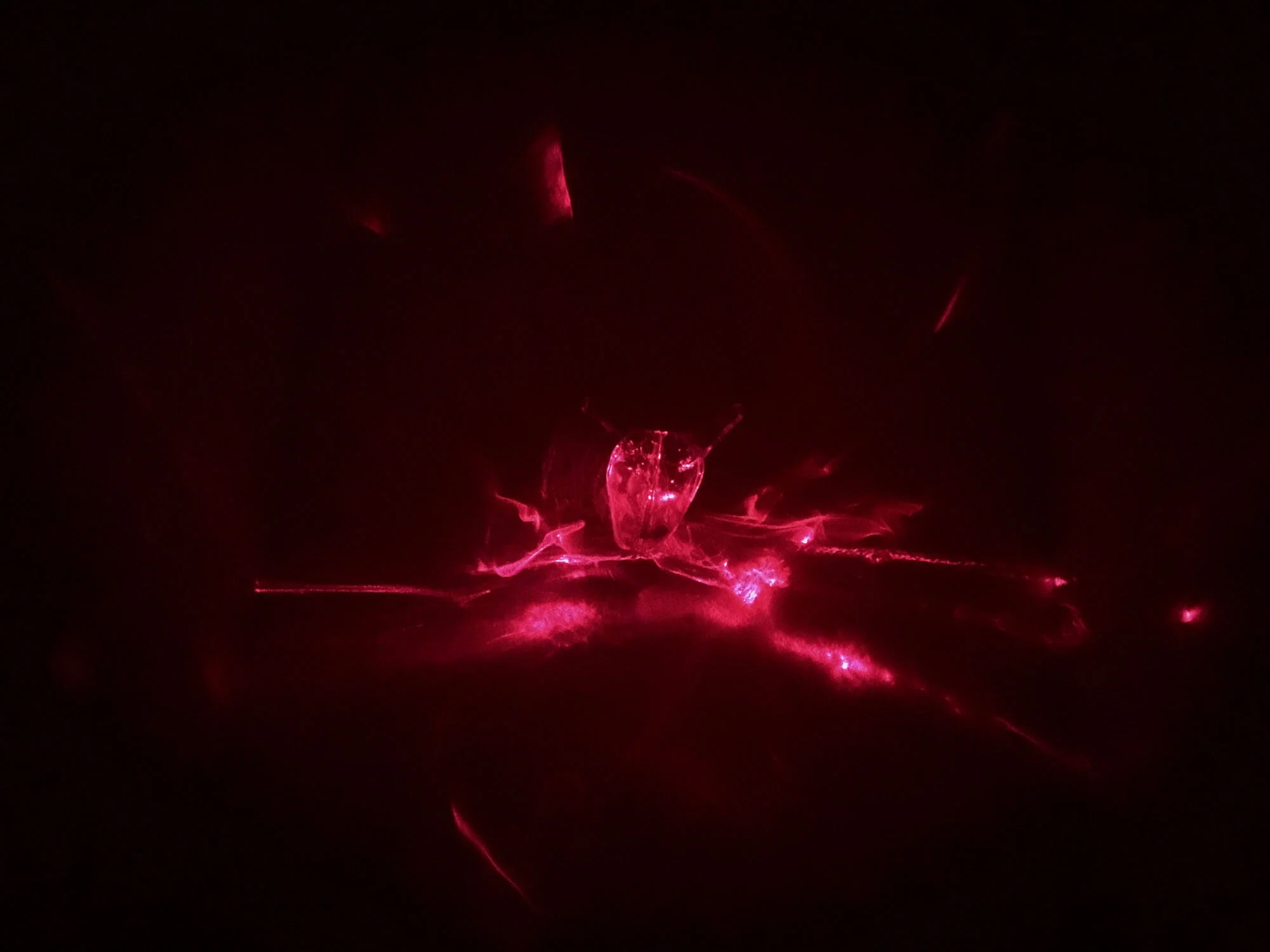 Concealed Shield is an installation I made for Spellbound: Magic, Ritual and Witchcraft at the Ashmolean Museum, Oxford 2018-19. The viewer enters a blacked-out room to see a large glass heat suspended above them. Red laser diodes illuminate the slightly swaying heart, causing red shadows to move gently around the room.